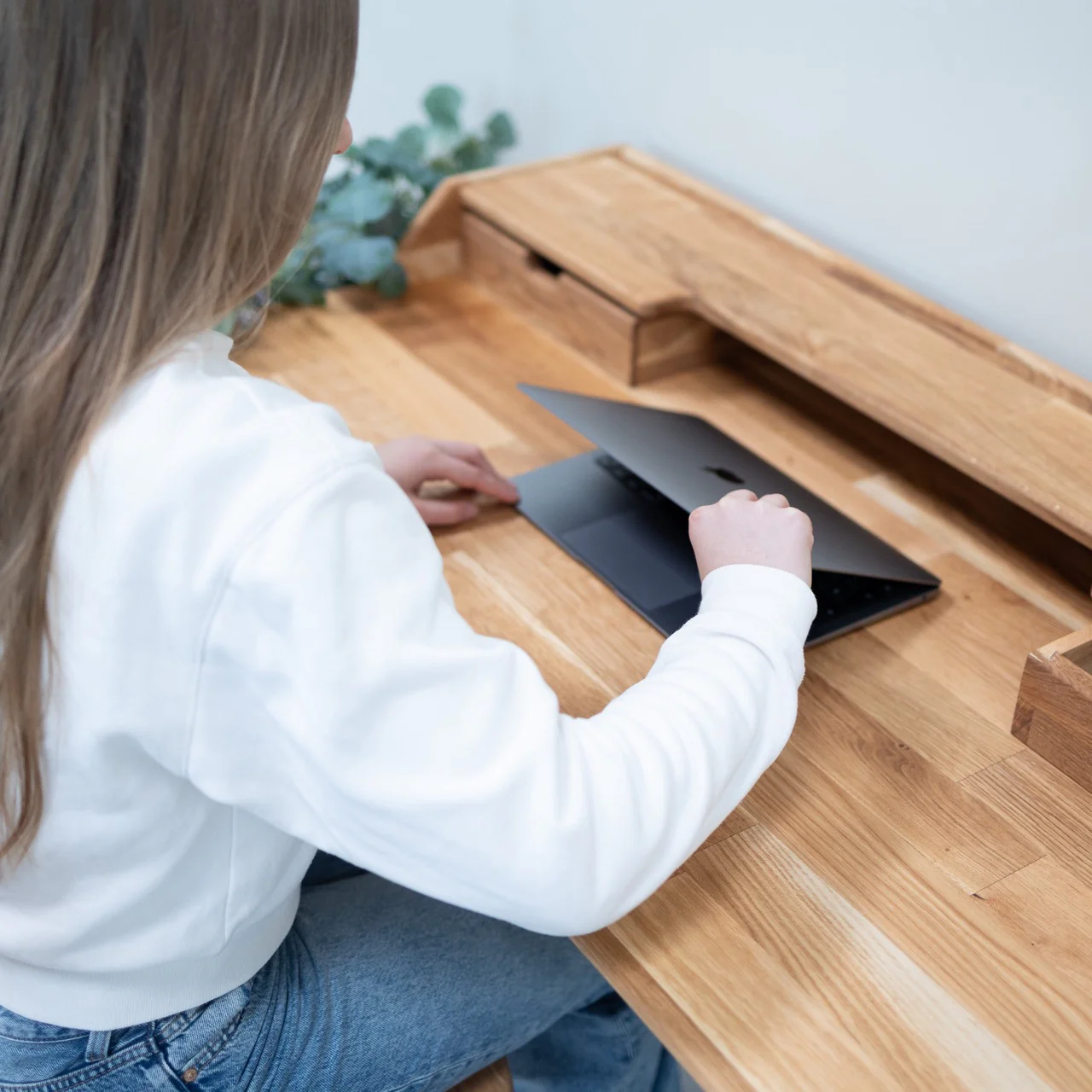 El escritorio Ana de roble macizo es la solucion perfecta para crear una oficina en casa con estilo y comodidad. Fabricado con roble de alta calidad y acabado en aceite, este escritorio aporta calidez y un toque natural a cualquier espacio. El soporte para monitor incluye dos cajones ideales para almacenar pequeños objetos, mientras que el espacio entre ellos es perfecto para colocar el teclado, liberando la superficie de trabajo. Un toque decorativo, como una pequeña planta, resaltará la belleza natural de la madera.