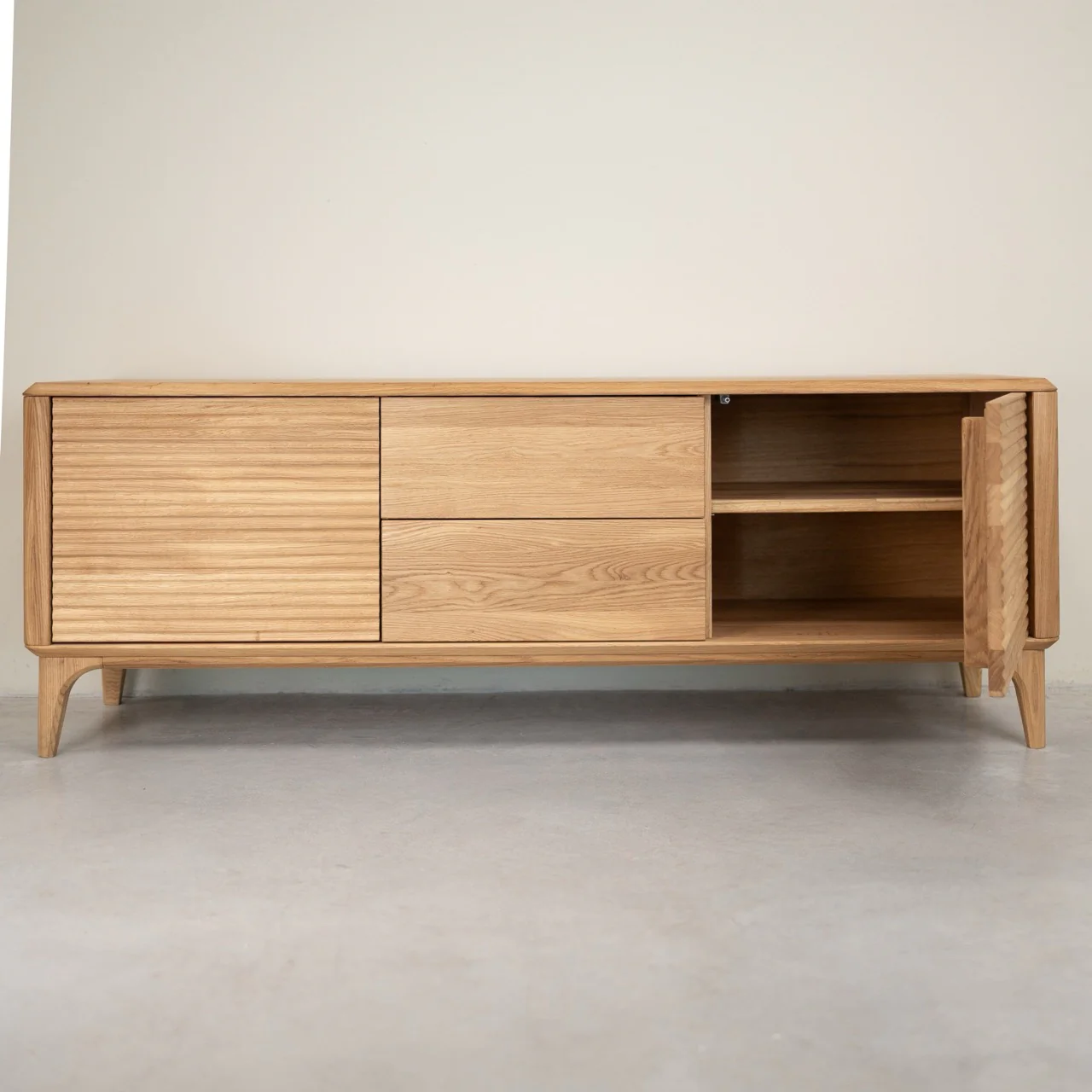 Mueble de TV Oxford 3.2.2 – elegancia y funcionalidad en madera maciza de roble. Su diseño escandinavo atemporal y sus amplios compartimentos ofrecen almacenamiento práctico y un toque sofisticado para tu hogar. Fabricado con materiales ecológicos y de alta calidad, garantiza durabilidad y estilo.